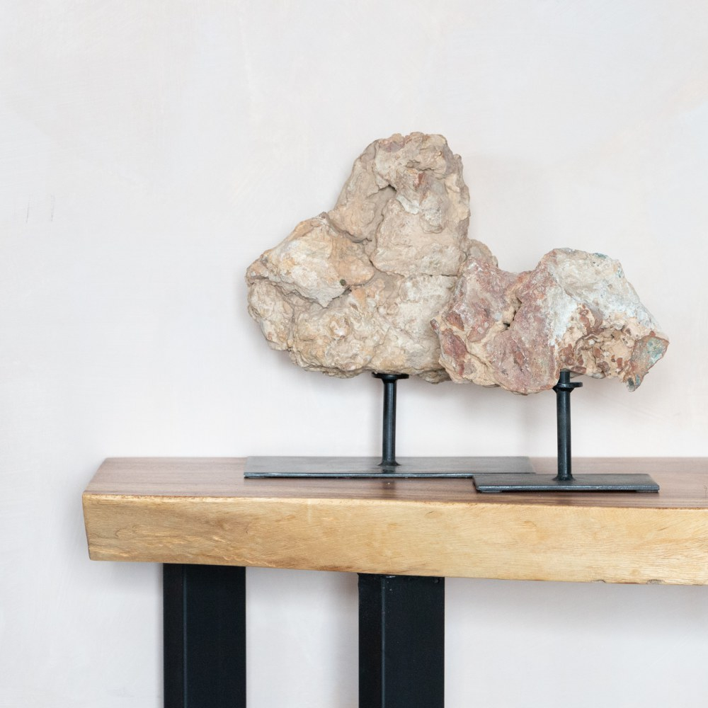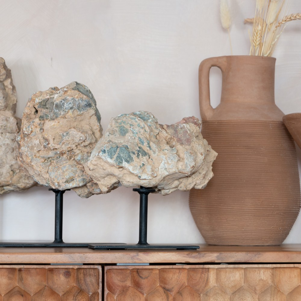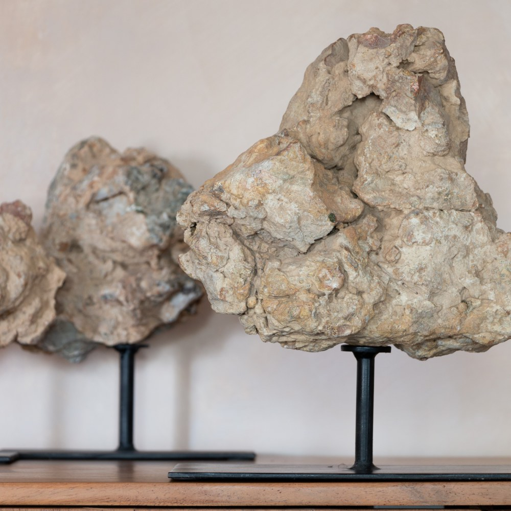 Liefhebbers van natuurlijke materialen kunnen hun hart ophalen met deze prachtige set van drie robuuste stenen op standaard.